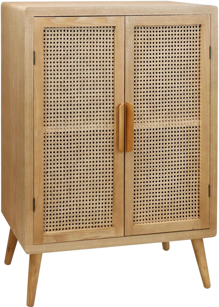 Cabinet Mandalay er et stilrent og funksjonelt skap som kombinerer varmt treverk med luftig rotting. De vevde rottingfrontene gir møbelet et lett og naturlig uttrykk, samtidig som skapet byr på god oppbevaringsplass bak lukkede dører.