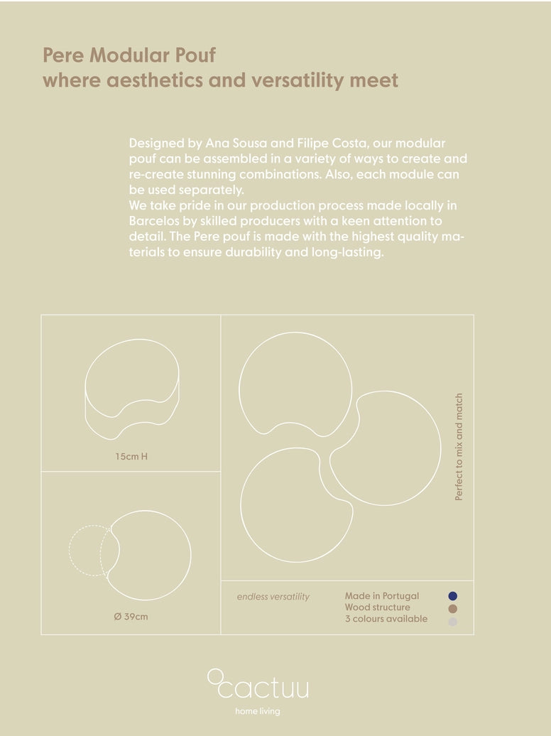 Pere Modular Pouf er et modulbasert møbel som gir deg full frihet til å forme rommet slik du ønsker. Puffen består av separate moduler som kan settes sammen i ulike kombinasjoner – eller brukes hver for seg. Resultatet er et allsidig møbel som fungerer like godt som sitteplass, fotskammel eller dekorativt element.
